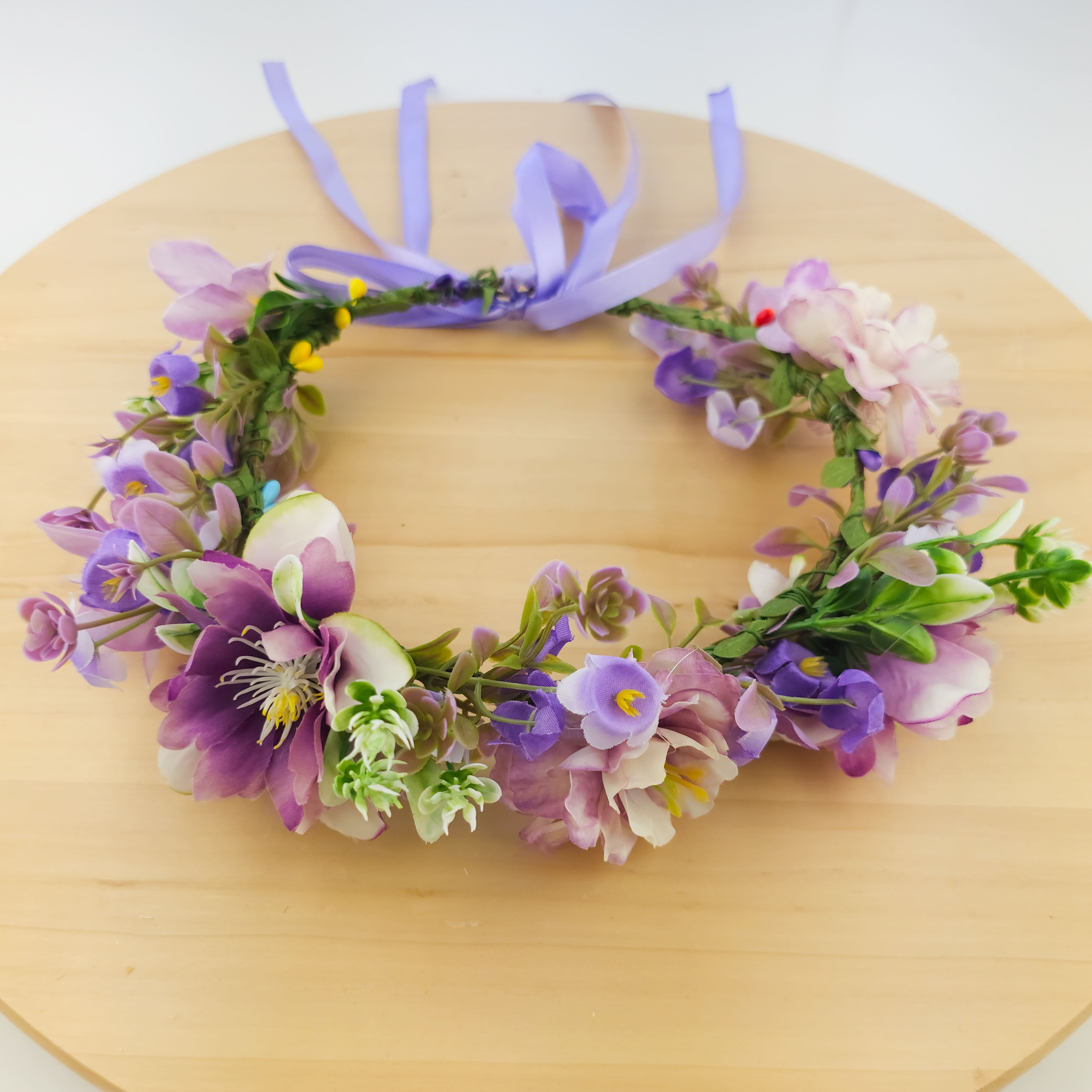 Στεφάνι με λουλούδια σε λιλά αποχρώσεις, ένα μέγεθος , καλύπτει απο 6 μηνών εώς 10 ετών