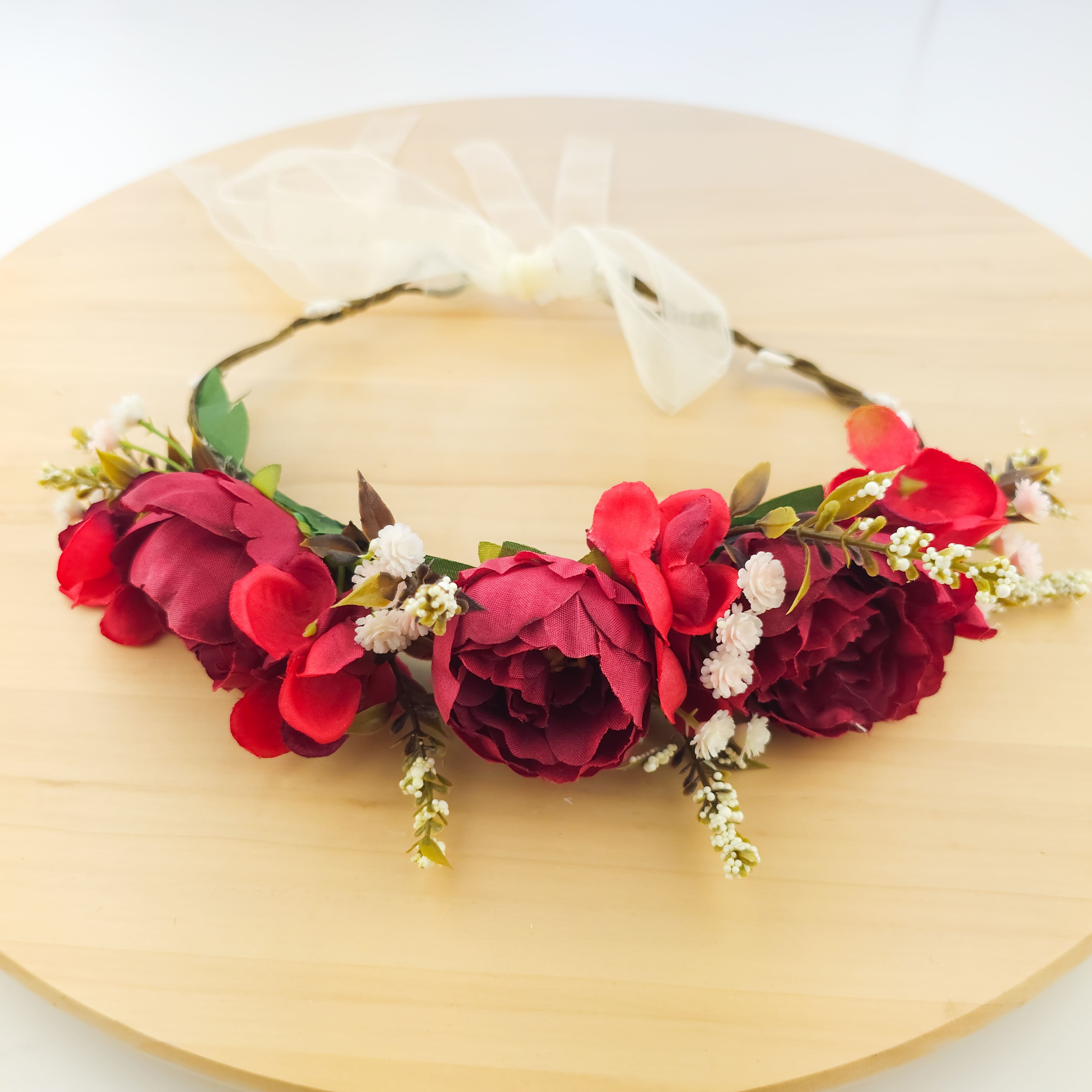 Στεφάνι με λουλούδια σε κόκκινες αποχρώσεις, ένα μέγεθος , καλύπτει απο 6 μηνών εώς 10 ετών