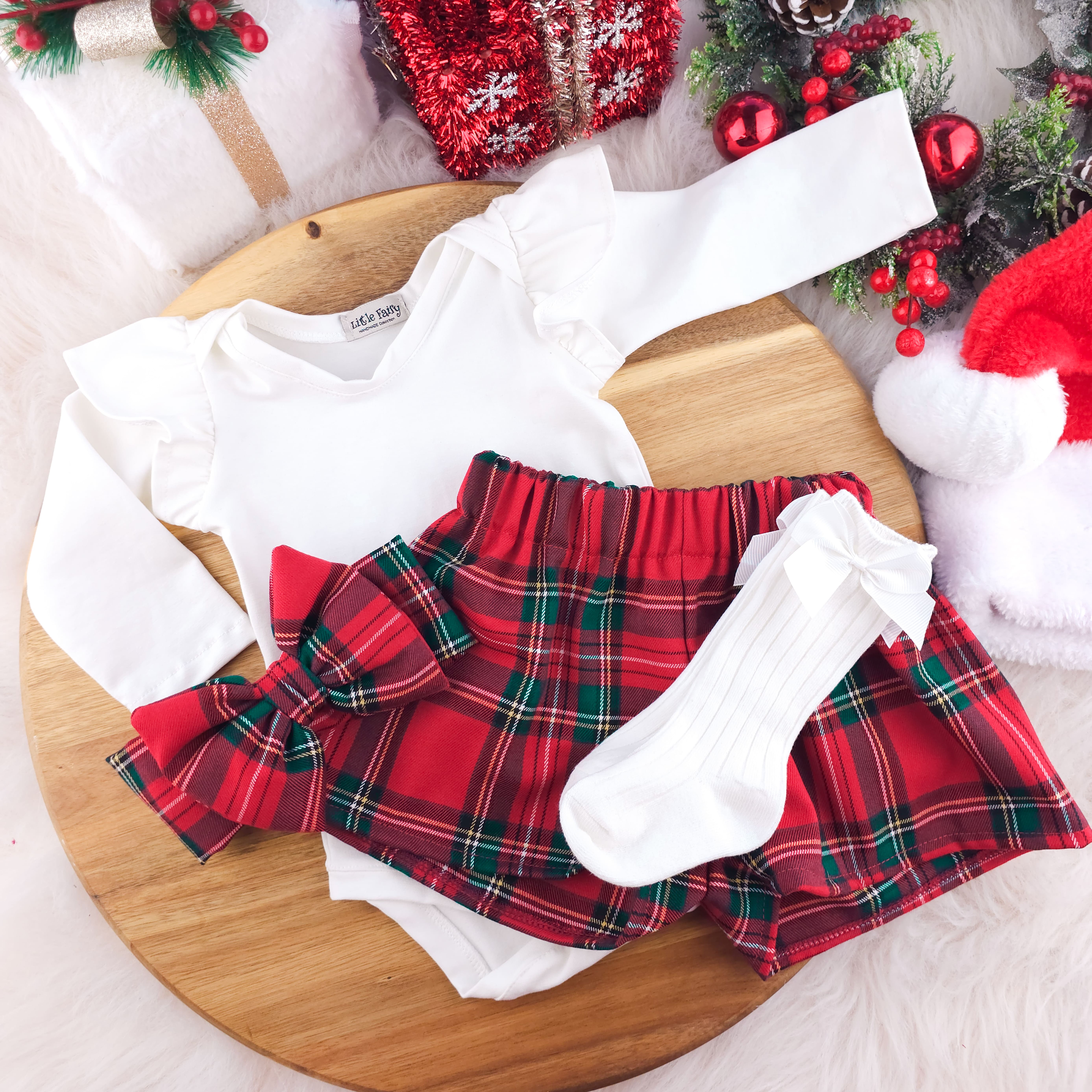 Ένα υπέροχο χειροποίητο χριστουγεννιάτικο σετ , αποτελείται απο βαμβακερό κορμάκι, σόρτς, κορδέλα και καλτσάκια σε κόκκινο ή λευκό .