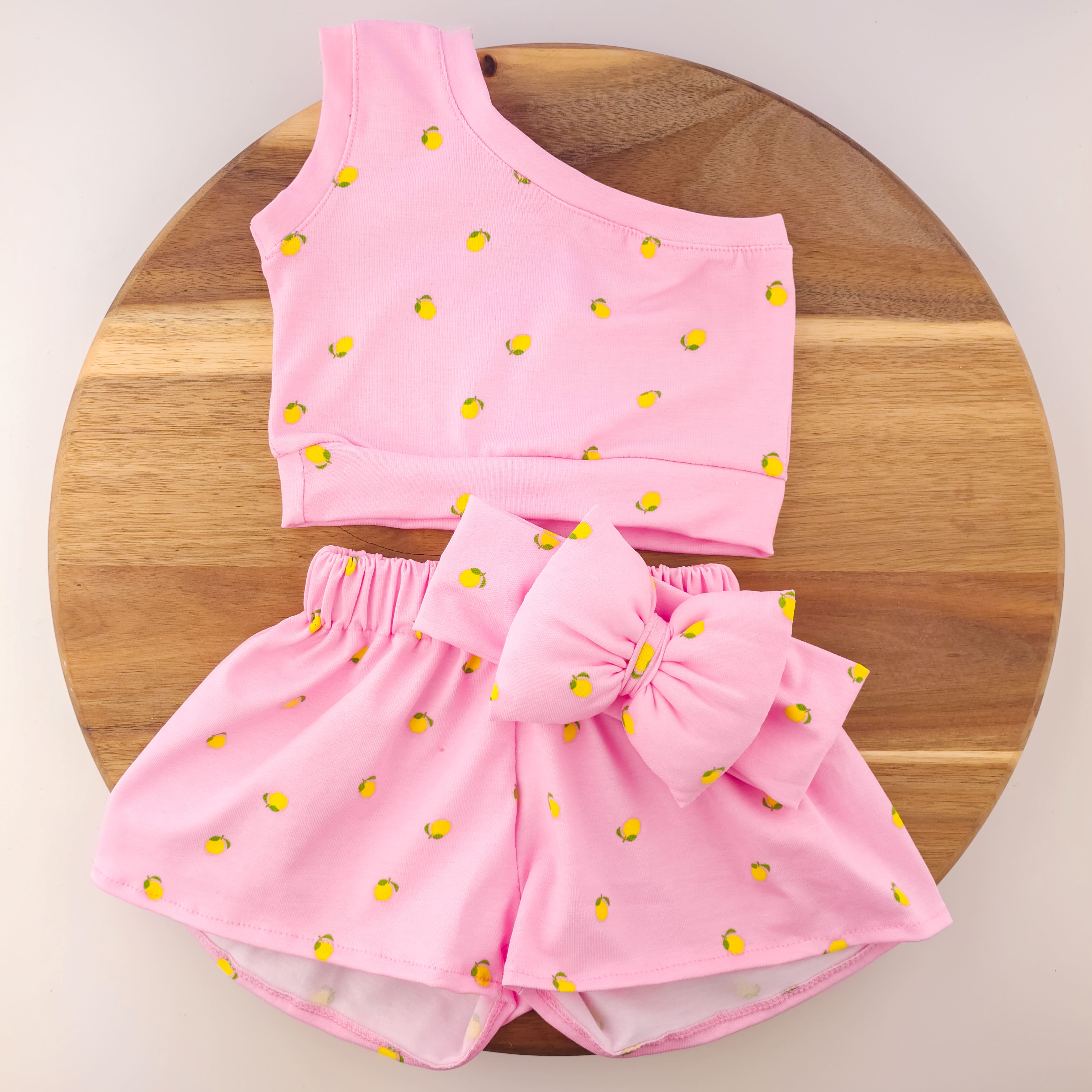 Χειροποίητο σετ ρούχων , αποτελείται απο crop top σορτς και κορδέλα ,(το αξεσουάρ μπορεί να αλλάξει)