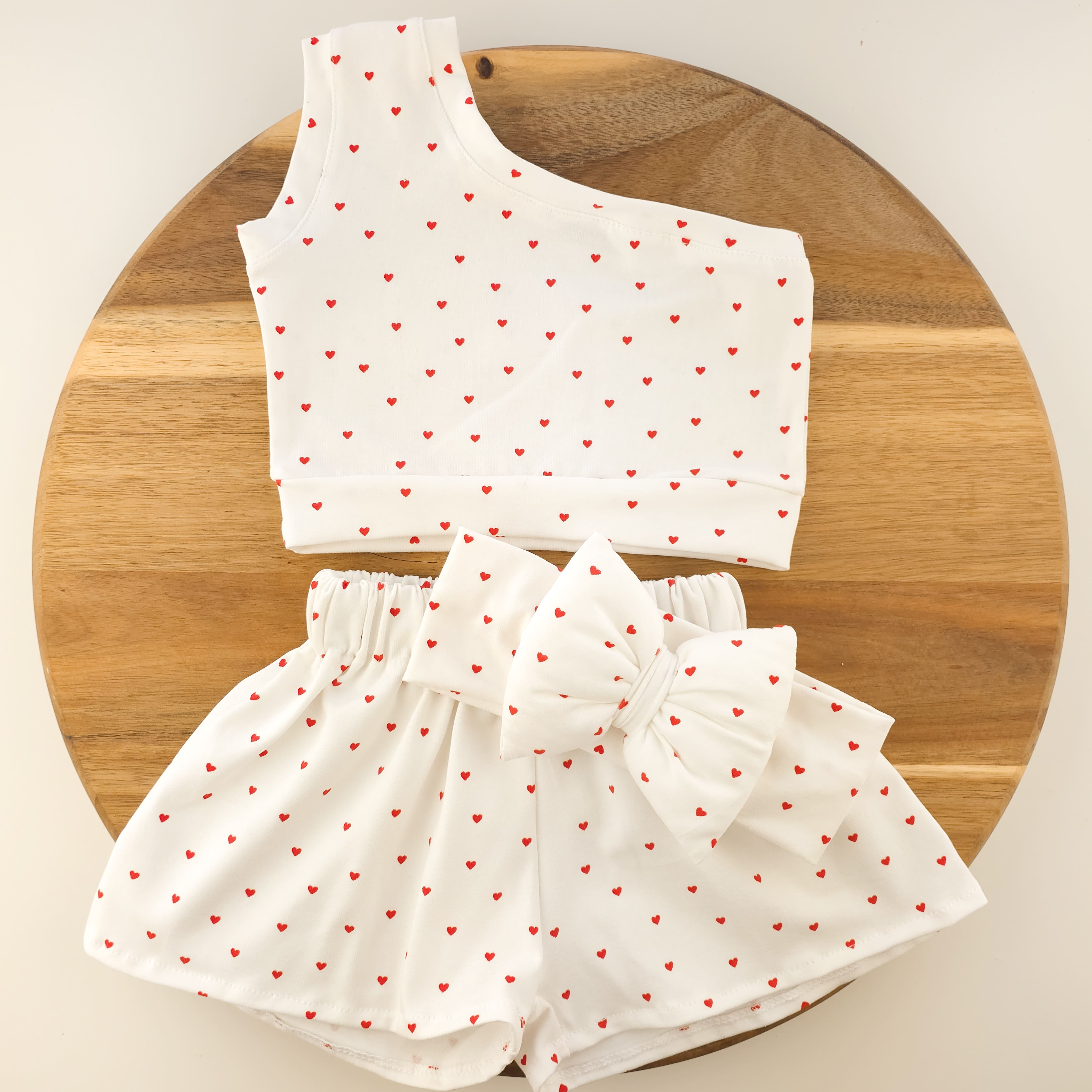 Χειροποίητο σετ ρούχων , αποτελείται απο crop top σορτς και κορδέλα ,(το αξεσουάρ μπορεί να αλλάξει)