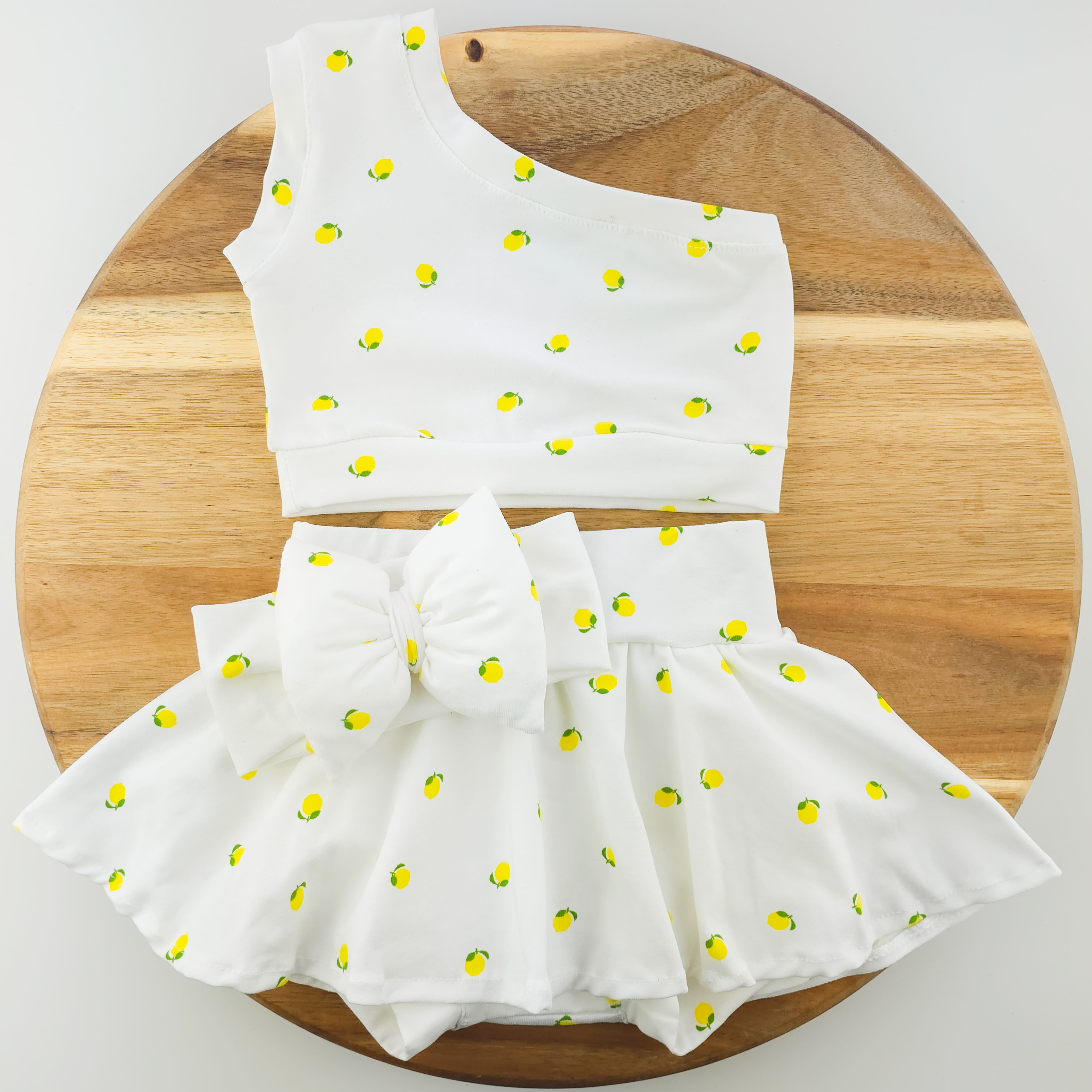 Χειροποίητο σετ ρούχων , αποτελείται απο Crop Top ,φούστα με ενσωματωμένο σορτσάκι και κορδέλα (το αξεσουάρ μπορεί να αλλάξει)