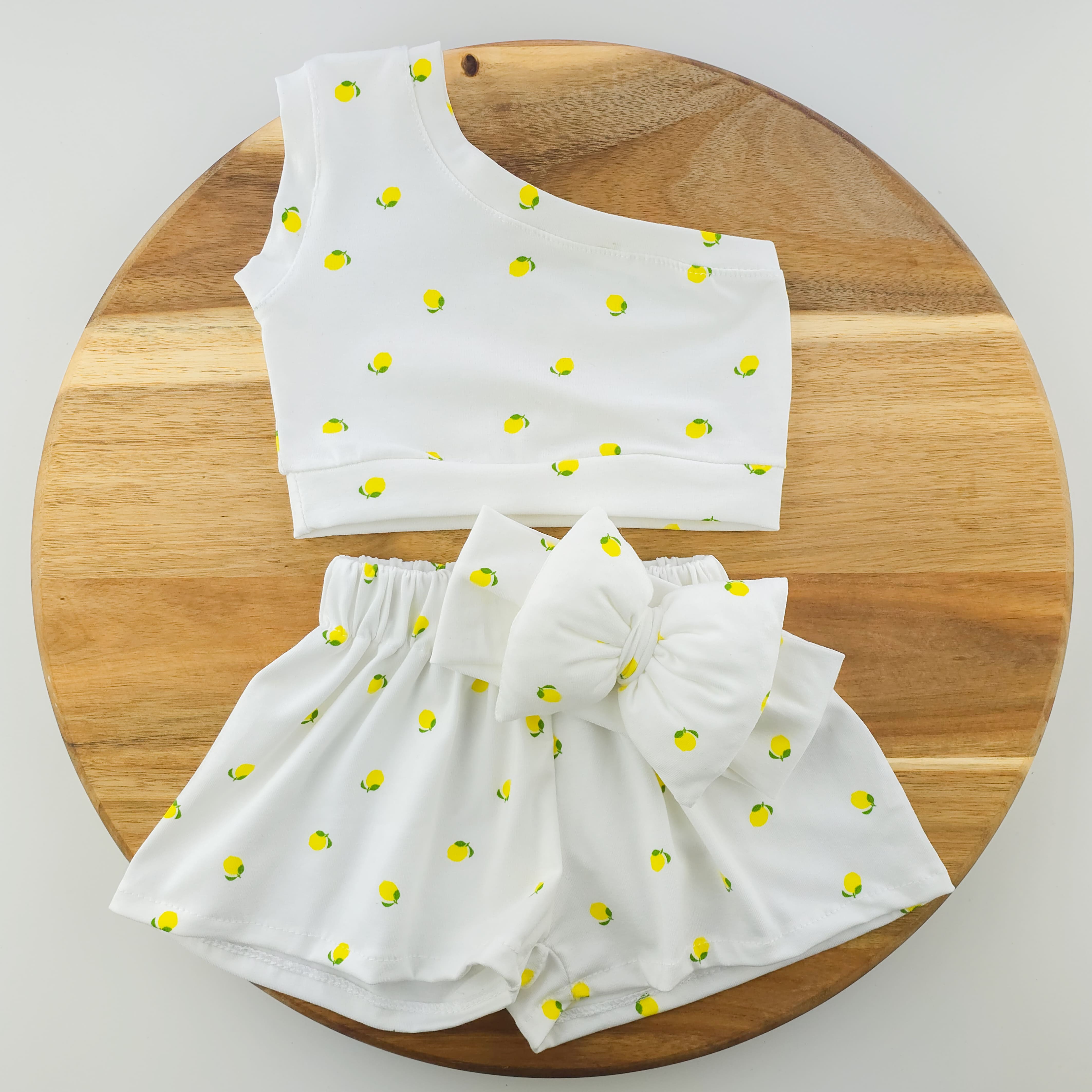 Χειροποίητο σετ ρούχων , αποτελείται απο crop top σορτς και κορδέλα ,(το αξεσουάρ μπορεί να αλλάξει)