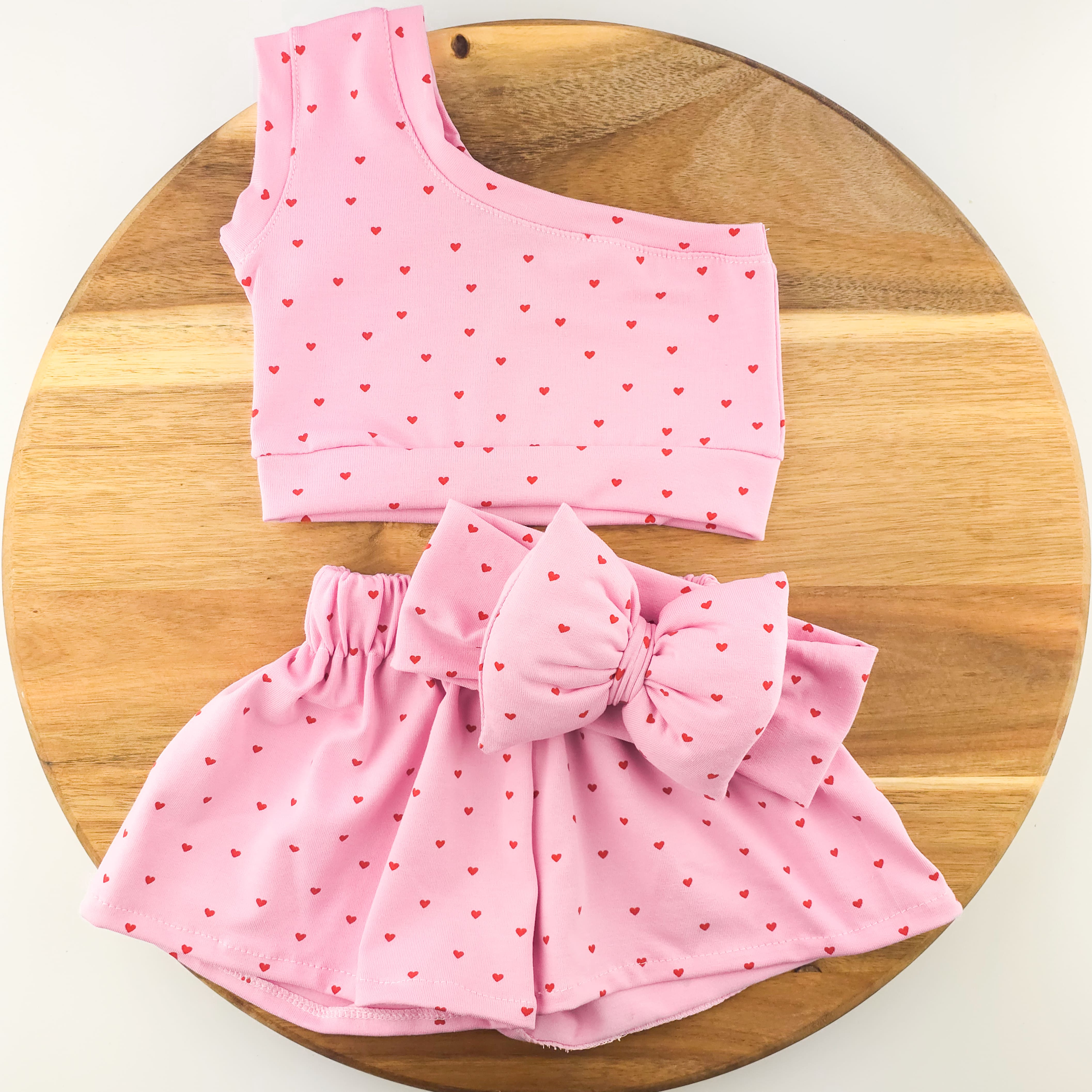 Χειροποίητο σετ ρούχων , αποτελείται απο crop top σορτς και κορδέλα ,(το αξεσουάρ μπορεί να αλλάξει)
