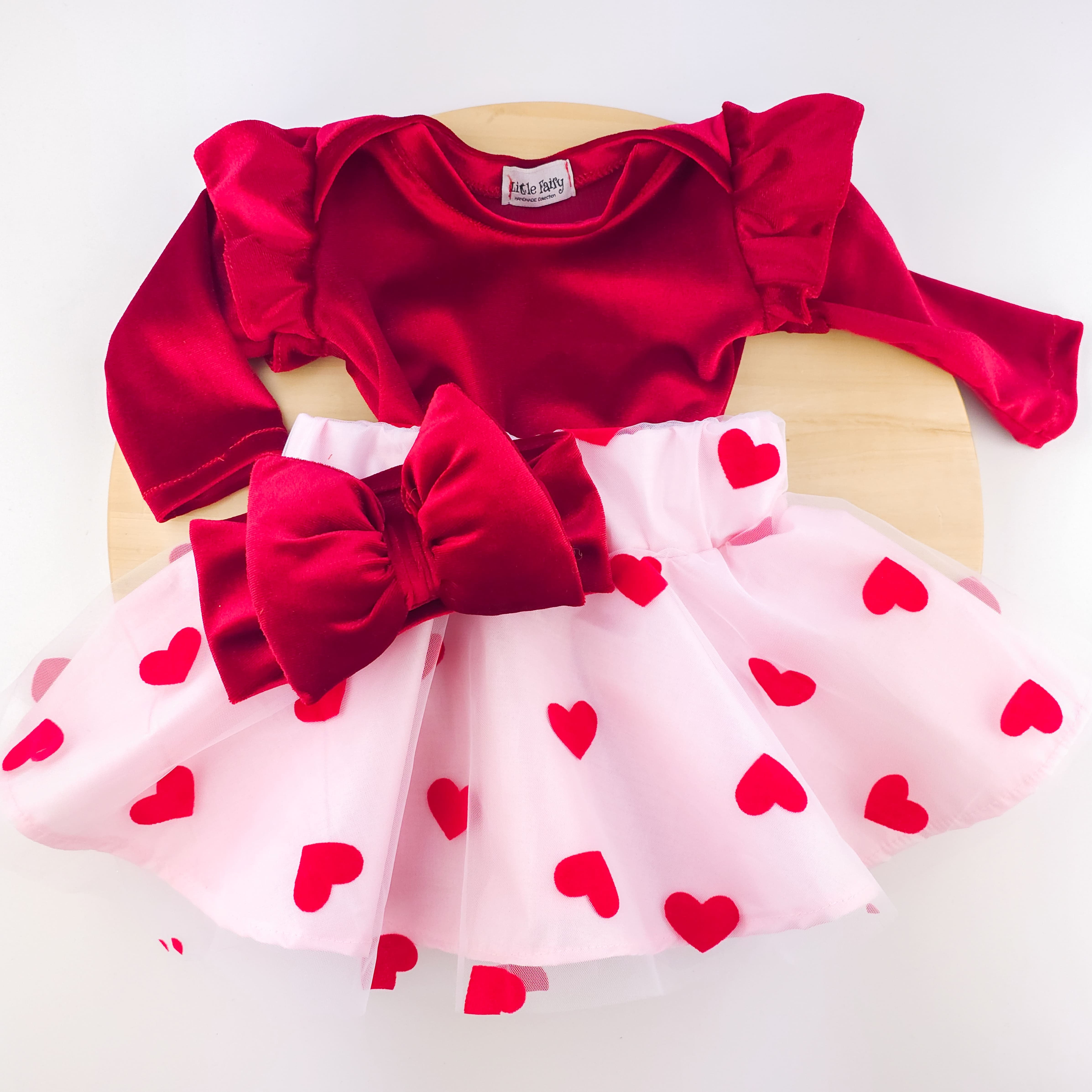 Ένα υπέροχο ρομαντικό σετ , ιδανικό για την ήμερα του Αγίου Βαλεντίνου, Αποτελείται απο βελουτέ κόκκινο κορμάκι και φούστα σε ροζ απόχρωση και κόκκινες καρδιές, μαζί πάντα με αξεσουάρ.